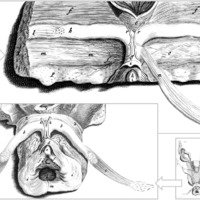 - En haut planche XII consacrée aux artères, en bas planche XIII consacrée aux veines. Outre le clitoris, la XII montre le « plexus rétiforme mis à nu » (oo), avec les fibres musculaires s’étendant sur lui en place d’un côté (mm) et soulevées de l’autre (nn), les artères dorsales du clitoris (rr) et leurs « rameaux pénétrant dans le plexus rétiforme et tout le pudendum » (ʃʃ). La XIII montre les veines dorsales du clitoris (kk) et leur branches « s’étendant à tout le pudendum » (ll).