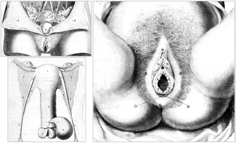 Détails des figures 1, 4 et 5, avec dans la première « le clitoris » (2) et les nymphes (3.3.), dans la dernière « le clitoris » (C), sa « couverture » (D) et les nymphes (E.E.).