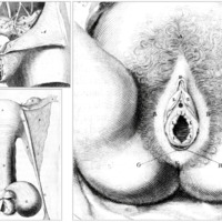- Détails des figures 1, 4 et 5, avec dans la première « le clitoris » (2) et les nymphes (3.3.), dans la dernière « le clitoris » (C), sa « couverture » (D) et les nymphes (E.E.).