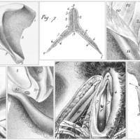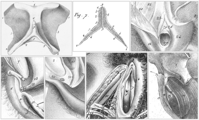 Les deux dessins du clitoris entier et cinq détails de dessins en incluant une partie. En bas à gauche la 1re coupe verticale passe à gauche de l’urètre, coupant la « branche » gauche du clitoris, et la 2e est médiane. J. Cloquet, Anatomie de l'homme, Paris, C. de Lasteyrie/Engelmann et Cie, 1821-1831, t.2 (muscles) pl. LXXX, t.4 (vaisseaux) pl. CCVII, t.5 (viscères) pl. CCLVIII, CCLXXIX et CCLXXX. Source : BIU Santé.