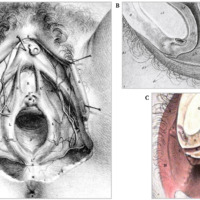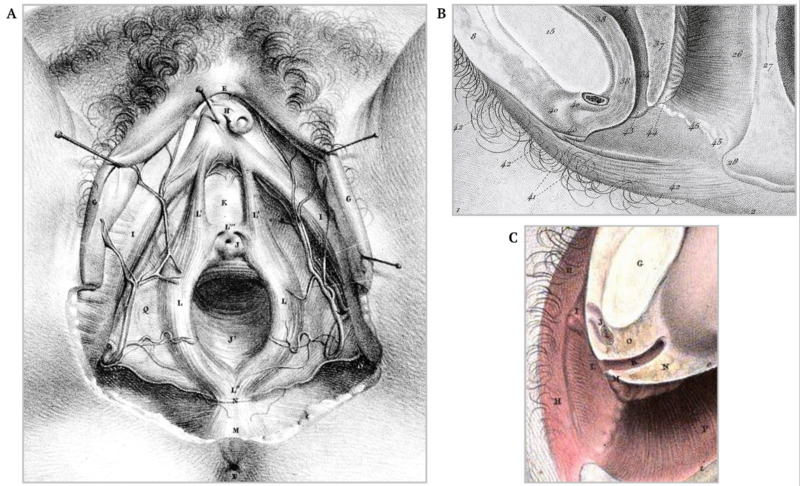 - A) Le clitoris « tiraillé en avant et en haut » (H) et « les deux faisceaux antérieurs du muscle sphincter de la vulve, fixés sur les racines du clitoris » (L’.L’).