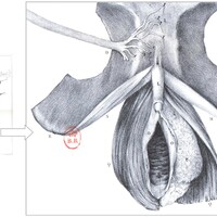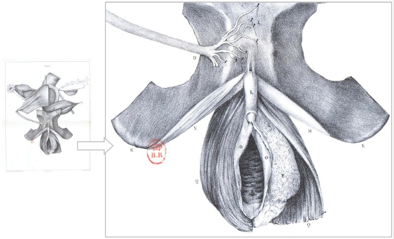 - L « clitoris et son ligament suspenseur », M « corps caverneux du clitoris », N « muscle ischio-clitoridien », OO « petites lèvres ou nymphes », P « plexus rétiforme », QQ « muscles constricteurs du vagin ».