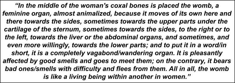 Doctors and philosophers of Greco-Roman antiquity (Hippocrates, Plato, etc.) very early on attributed special properties to the uterus, making it an entity that influences women’s health and behaviour. Aretaeus of Cappadocia, author of a medical treatise, On the Signs and Causes of Acute Diseases, writing in Greek in the 1st or 2nd century AD, described it as “a living being within another.” Like other colleagues of his time, he claimed that the uterus was mobile and travelled within a woman’s body according to circumstances and completely independently of her will (fig. 1). This tendency had already been described several centuries earlier by Hippocratic physicians, who believed that the womb could migrate within the body depending on its heat and humidity, but also on odours, thus causing health problems. When dry, the uterus moves in search of moisture, which is believed to be beneficial. The medical literature of the time contains numerous gynaecological remedies, potions, and pessaries* made from strongly scented substances intended to return the organ to its place and thus cure the patient. It was also during this period that hysteria came to be understood as a disease caused by the wandering of the womb (see the notice “An organ that is still vulnerable even today?”).