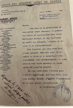 Comme en témoigne ce courrier adressé à Jeanne Bucher, en mai 1939 par l’Union des Sociétés Juives de France dont Chareau, Chagall, Lipchitz font partie du comité d’honneur, son engagement pour les victimes du nazisme et de l’antisémitisme est total.