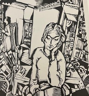 Jeanne Bucher mène parallèlement une activité d’éditrice et de galériste comme l’illustre si justement le peintre et graveur néerlandais Nicolas Eekman (1889-1973) en 1925 dans cette gravure sur bois intitulée la Bibliothèque. Dans un espace chaotique, Jeanne au centre lit dans deux univers qui se télescopent : la littérature représentée par des rayonnages de livres destinés au prêt, activité qu’elle abandonne progressivement au profit des beaux-arts signifiés par l’entassement de cadres et la présence de sculptures. La silhouette à l’arrière-plan est probablement celle d’Andrée Herrenschmidt (1898-1982), la bibliothécaire de la galerie que l’artiste rencontre grâce à Jeanne Bucher peu de temps après le décès de sa première femme.