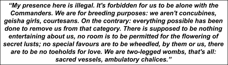 In her 1985 novel The Handmaid’s Tale, Margaret Atwood makes the uterus the place of all encounters and fantasies. In the “Republic” of Gilead, where sterility has taken hold, the few fertile women have been transformed into productive wombs serving the infertile families of the elite; their red habit, so recognizable by its colour reminiscent of female blood, makes them “scarlet handmaids.” In this new world, children must be born from ritualized rapes within the household, with the handmaid disappearing into the large marital bed, between the bodies of the biological father and the social mother. She is reduced to an organ to be filled. June (renamed Defred), played in the television series by Elisabeth Moss, is in the service of the Waterfords. In a few sentences (fig. 4), she sums up the fate of the maids’ vanished bodies. Indeed, all that remains of them is the essential, the precious organ, at the service of the community. Devoid of their own identity, deprived of their privacy and all rights over their bodies, the handmaids are reduced to a uterus, an autonomous and detached part, collectivized and sacrificialised by the Gilead regime and its social elite.