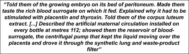 The motif of the male uterus is joined by that of the uterus projected outside the body, or even artificialized. 16th-century alchemist Paracelsus’ recipe for creating a homunculus* by rotting sperm in a pumpkin echoes the artificial wombs described in the first chapter of Aldous Huxley’s 1932 novel Brave New World (fig. 3):