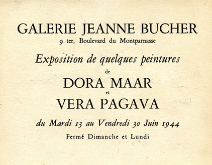 Devant les toiles de la Géorgienne Vera Pagava, Jeanne Bucher s’exprime ainsi : « Les femmes sont très douées, mais elles n'ont pas toujours la persévérance. Cependant j'ai confiance en regardant votre visage et je ferai votre exposition. »(4) Pour lui assurer un plus grand public, elle associe son nom en juin 1944 à celui de Dora Maar sachant que Picasso amènerait ses amis visiter l'exposition. Elle ne s’était pas trompée : le livre d’or est couvert de signatures d’intellectuels parisiens résistants et, en 1966, Vera Pagava représentera la France à la Biennale de Venise où une salle est consacrée à ses aquarelles.